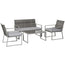 - Four-piece set, includes two wide chairs, a two-seat sofa and large coffee table