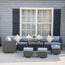 - Made from a steel frame construction and covered with fire retardant and weather resistant PE rattan 10pc rattan set with multiple configurations to suit Polyester cushion cover with zippered design for easy washing Toughened tempered glass for superior strength and safety Thick padded cushions for ultimate comfort Assembly required Include: 3 x corner sofa, 3 x armless sofa, 3 x footrest, 1 x table, 7 x seat cushion, 7 x back cushion, 3 x footrest cushion, 4 x throw pillow